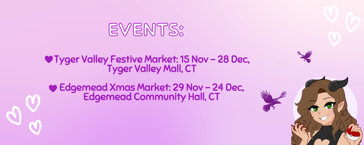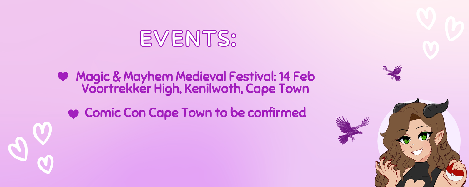The Raven's Claw is an online store only, however I can often be spotted at conventions around SA and at craft markets around Cape Town. Details will appear on my Social Media pages and a post will be added to my website when I have events scheduled.