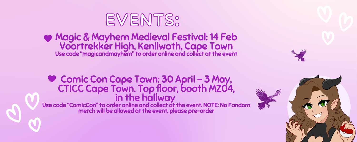 I'll be at Magic & Mayhem, Feb 14th at Voortrekker High, Cape Town. Tickets can be bought through their socials. If you wish to order online and collect at the event, use code "magicandmayhem" at checkout, to remove the shipping fee.