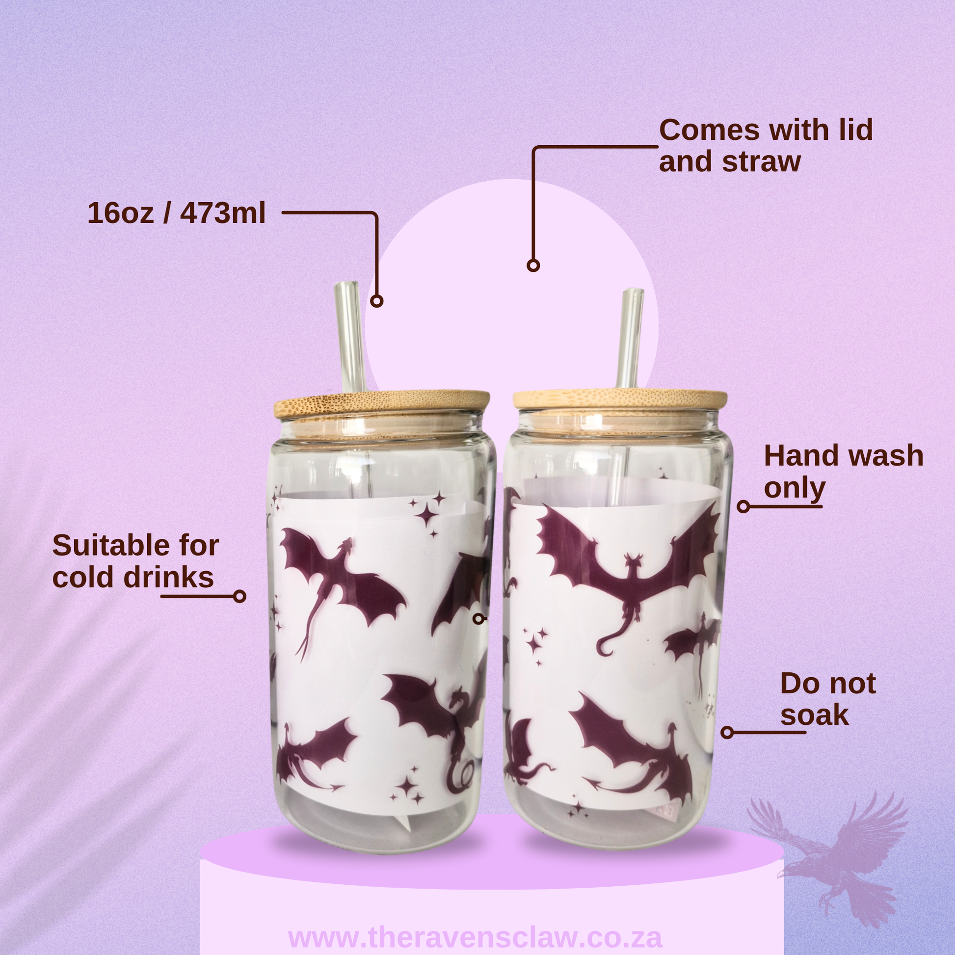 Glass size: 16oz, 473ml. Care: Hand wash only. Do not soak or microwave. Suitable for cold drinks. Comes with lid and straw. Bamboo lid should be washed and immediately pat dry, do not soak.