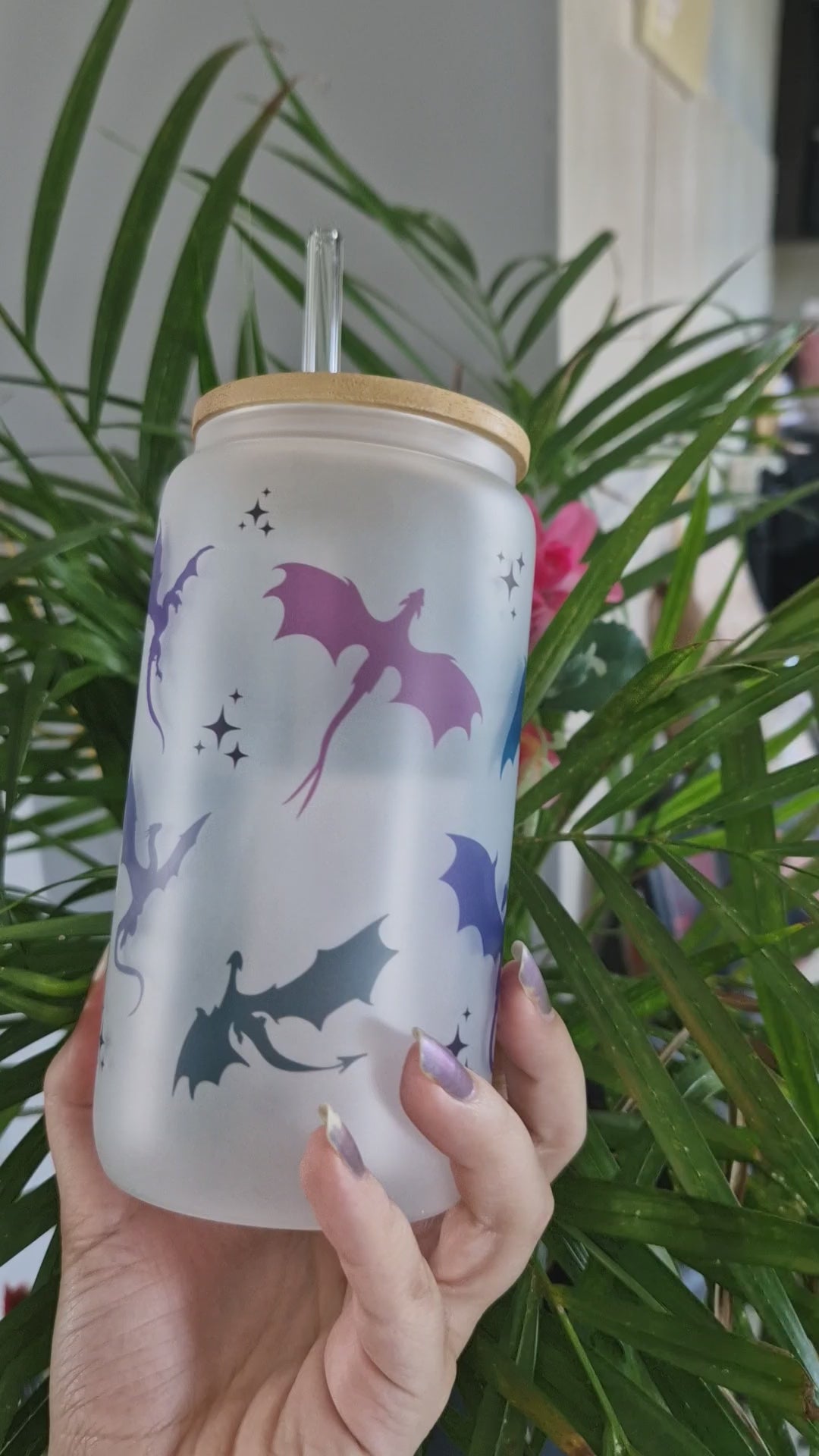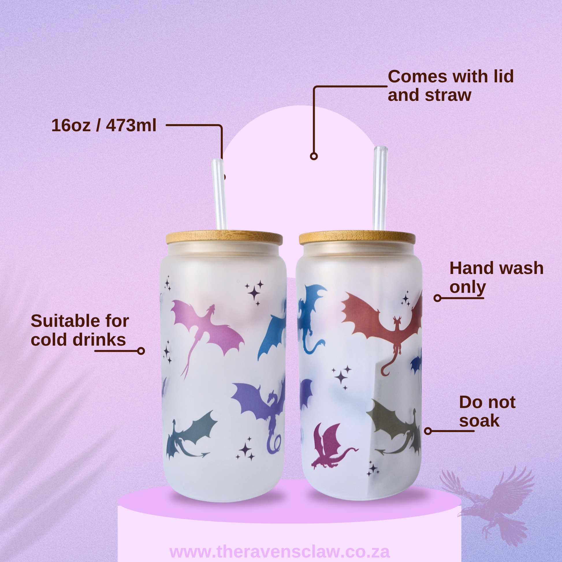 Glass size: 16oz, 473ml. Care: Hand wash only. Do not soak or microwave. Suitable for cold drinks. Comes with lid and straw. Bamboo lid should be washed and immediately pat dry, do not soak.