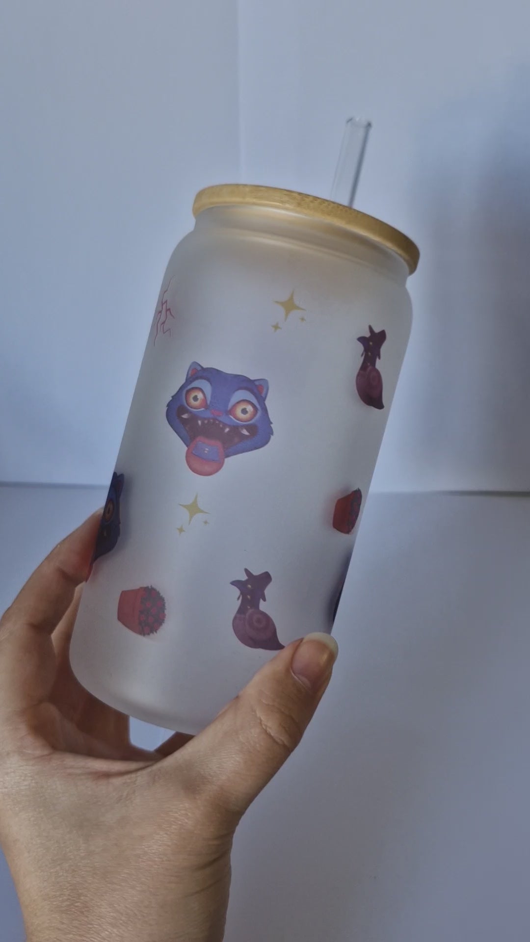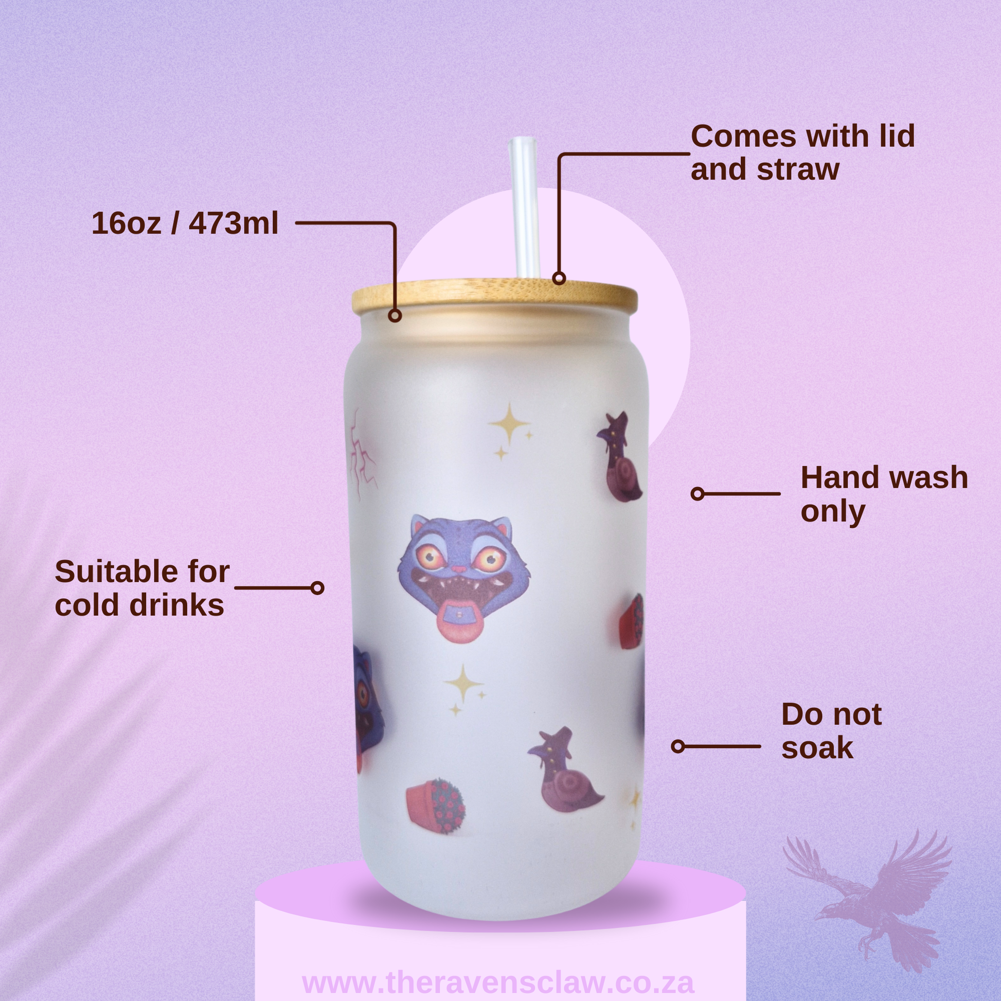 Glass size: 16oz, 473ml. Care: Hand wash only. Do not soak or microwave. Suitable for cold drinks. Comes with lid and straw. Bamboo lid should be washed and immediately pat dry, do not soak.